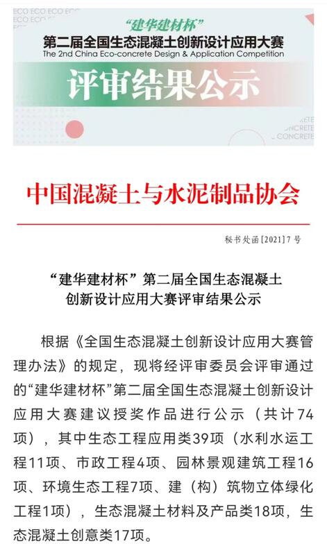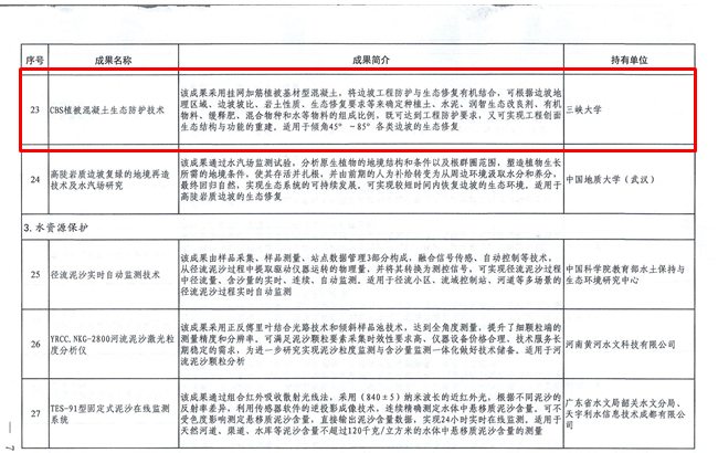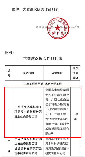 為深入貫徹落實習近平總書記關于保障國家水安全重要講話精神,積極推動新階段水利高質量發展,切實做好成熟適用水利科技成果推廣運用,切實提高行業科技水平,水利部組織開展了2021年度成熟適用水利科技成果的征集、評審與公示工作。我公司研發的核心技術“CBS植被混凝土生態防護技術”獲得入選,其應用項目“廣西馱英水庫樞紐工程混凝土邊坡植被混凝土生態修復工程”在2021年度“建華建材杯”第二屆全國生態混凝土創新設計應用大賽榮獲一等獎。